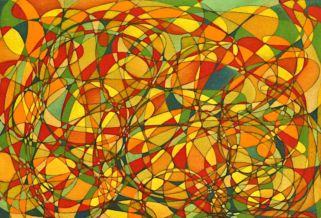 This is pretty typical of the work I’ve been doing lately. (My son calls them “chaotic”.) I have twenty five or thirty of them going. They tend to get to be unworkable when I’ve painted in a lot of shapes and force me to spend half my time cleaning paint off of my hand and wiping smeared paint off of things. If I work on a bunch of them at once, it saves me remixing paint, leaving excess on the palette to dry up and go to waste, and… it keeps me from getting bored.