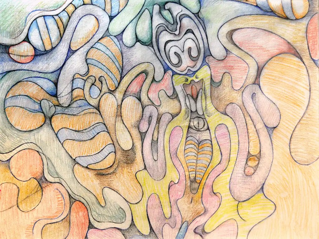 I gave our queen a bit of cleavage (Seemed necessary… she’s “dark”.), a pair of velvet hot pants and striped stockings that reflect a few of the other forms in the painting. I stylized the rest of it and made a few changes here and there, then made an attempt to map out some of the colors with watercolor pencils. It got 2 more coats of acrylic medium. That blended the colors into fairly continuous fields as well as fixing the drawing into the canvas. This dried overnight and got sanded again. (rotary sander… it makes things go much faster. You need to be careful on stretched canvas though.)
