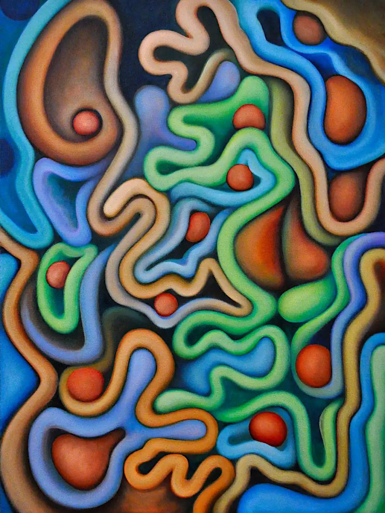 I spent some time yesterday listening to somewhat newer “psychedelic“, cleaning things up and getting some of the final colors in place. I think I managed to fix the upper right and reflecting it below is just going to be a matter of making the existing forms a bit brighter. The blues and violets are next.
