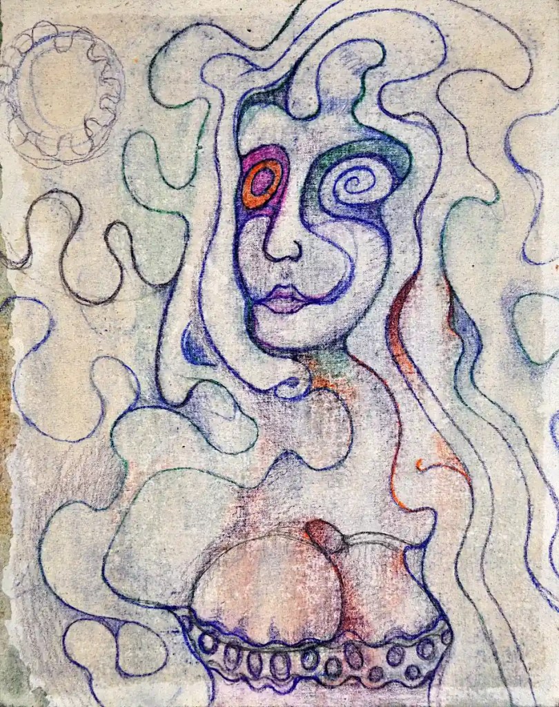 My graphite paper has given up the ghost after many years of faithful service, so… I transferred this by rubbing pastels on to the back of the print. That always leaves things a little messy. The lines are darkened with watercolor pencil. I’ve shaded things a bit just to get them started… I sprayed it with water to set the drawing, further start the shading process and give me a few random drips. This is wet in the photo.