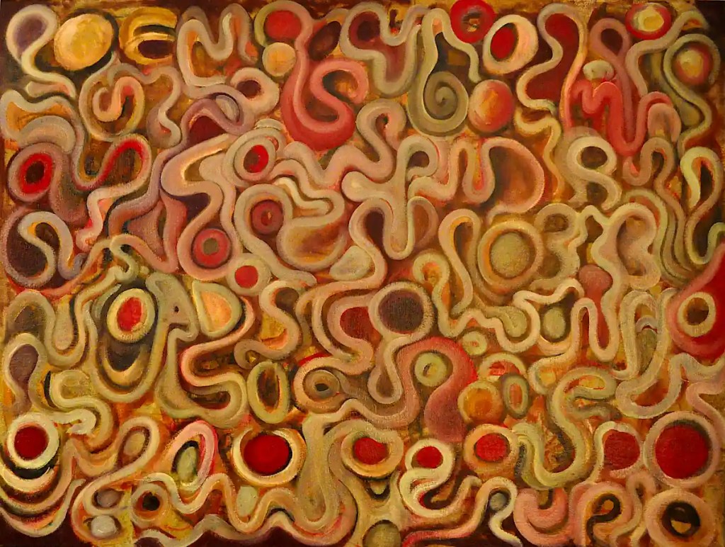 I spent several hours listening to “space rock“, adding colors, developing forms and making things work together. I’m much more energized by this than I have been by a painting in quite some time. The only reason I put up the brushes was that the paint started to get a bit thick and “gloppy“.