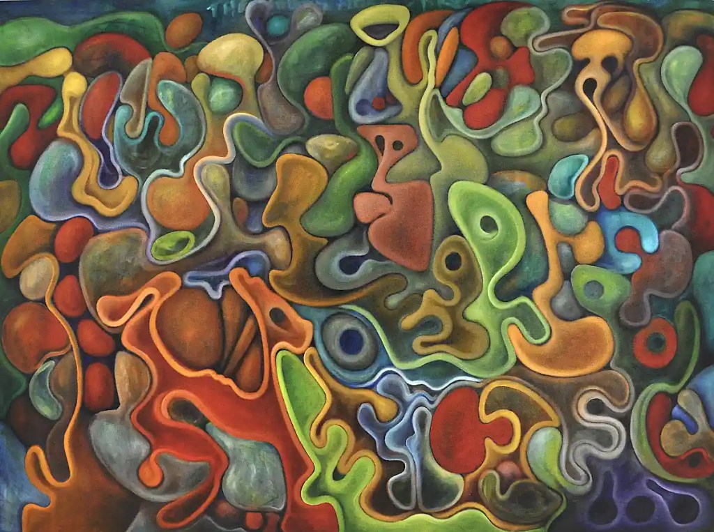 This is the first oil session. Yesterday, before I sealed this I painted large patches of phthalocyanine green across it and sprayed them down with a water bottle. The drips aren’t all that obvious but it did work very nicely as a sort of glaze to pull the whole thing together. Today, I’m just trying to get the (oil) colors started and rework a few of the forms so they fit together a little better. It is going a lot faster and using a lot less paint than the acrylics.