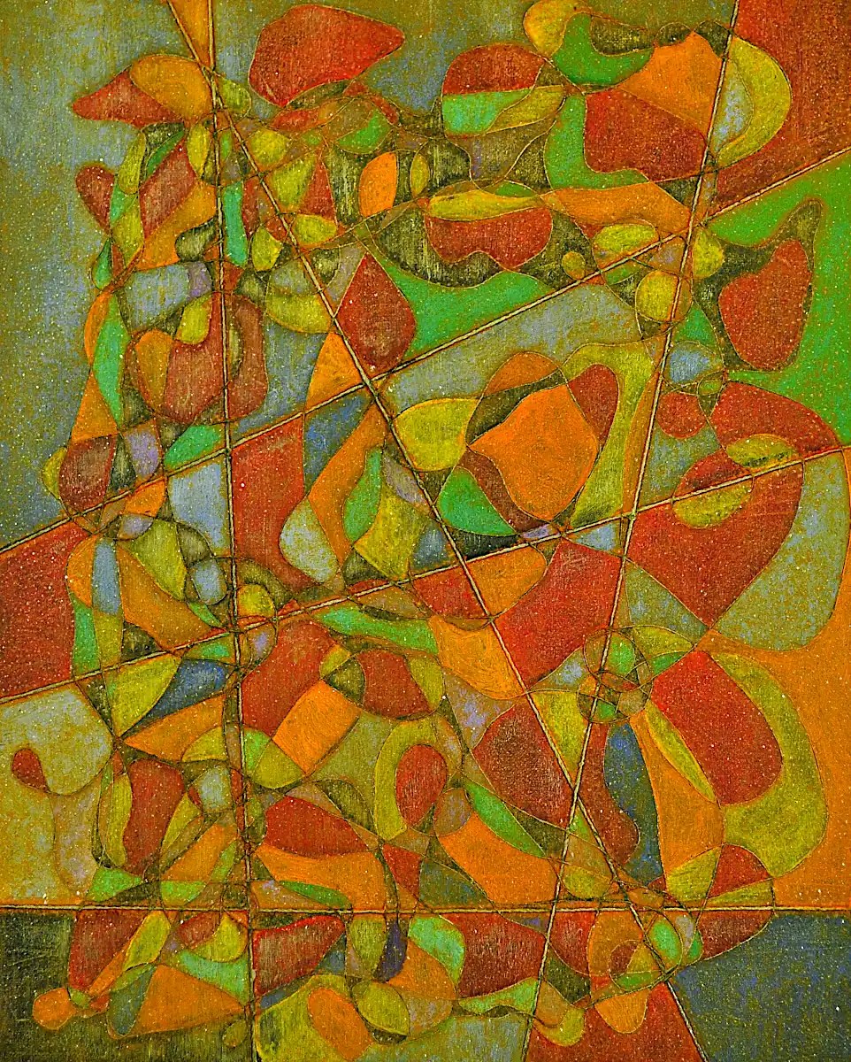 Colors are Golden’s, Open Acrylic Cadmium Red, Cadmium Yellow, Cadmium Orange, Hooker’s Green, Phthalocyanine Blue and Indian Yellow with Utrecht’s Titanium White.