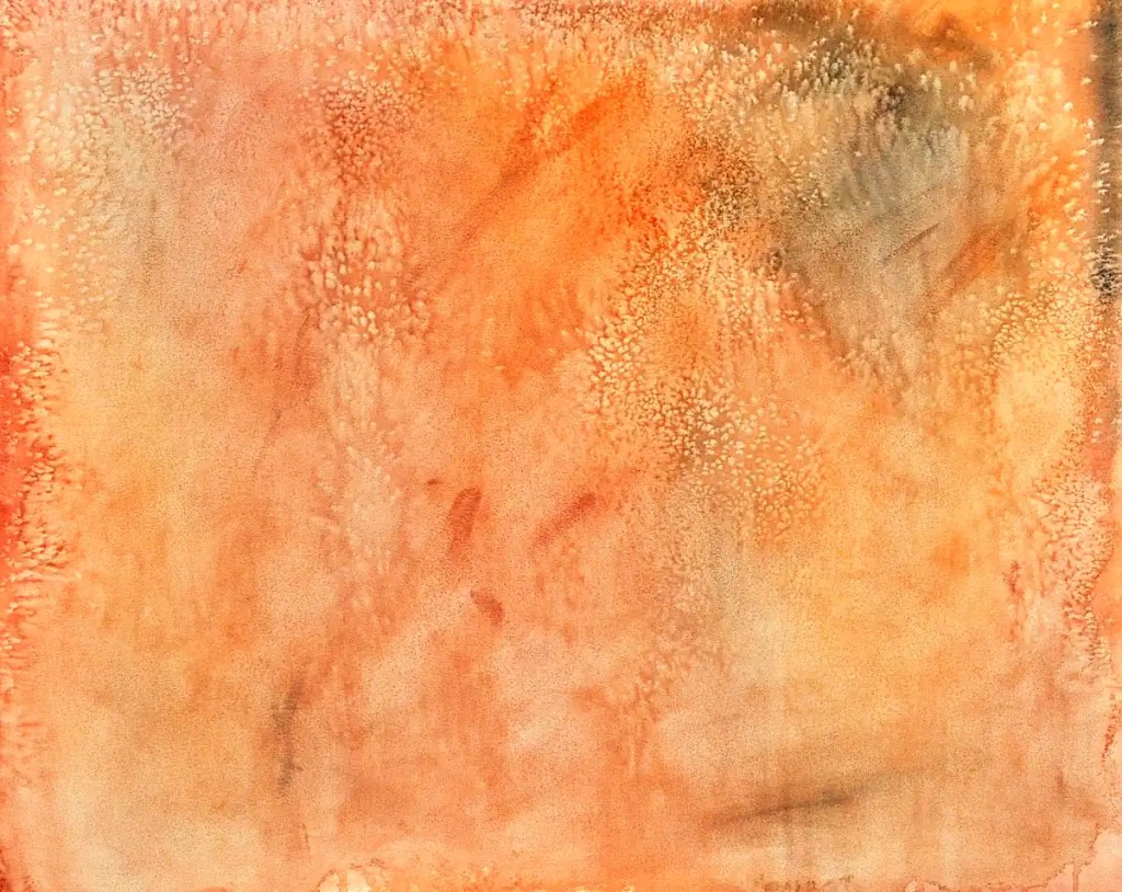 Given that I just finished 3 pieces and have several others close… I decided to treat myself and start a new one. This is 22×28 inches, which just happens to be the size of my largest, empty drawing board. It’s on Arches oil paper. This first image is the thing covered with a watercolor wash of Sennelier’s Chinese Orange as well as Winsor Newton’s Cerulean Blue and Brown Madder. I tossed some salt on it to give it the texture.