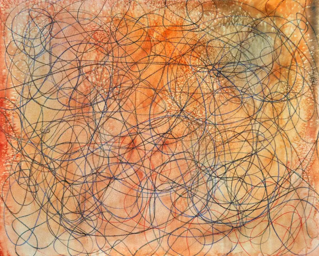 After letting it dry for a day, I scrubbed off the salt. Half an eraser later… I did the automatic drawing/scribble you see here with watercolor pencils.