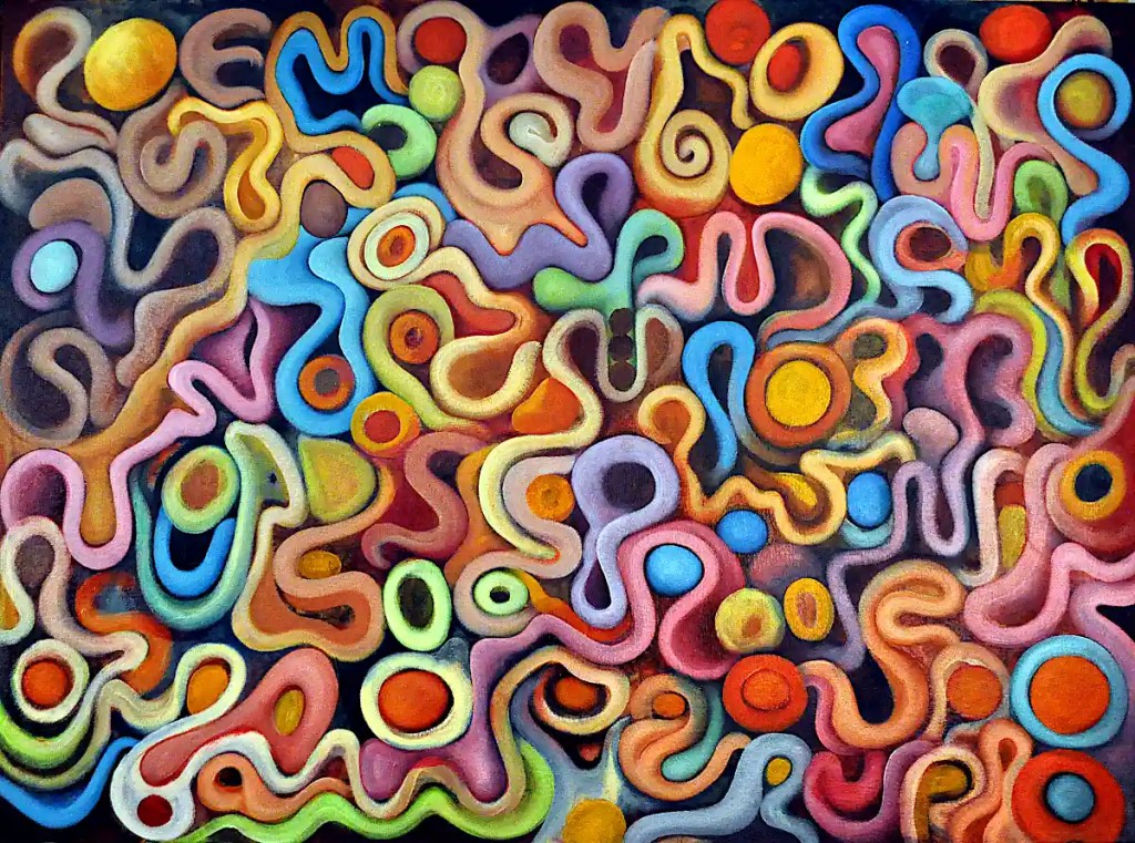 This is the result of a couple of sessions. The colors are pretty much the same. I did add some of Sennelier’sAlizarin Crimson. I had an insatiable desire to put pink things in this. I also feel a need to add many spheres and rings so that I can build some sort of “Vasarelly meets Miro and Gorky in alphabet soup candy land” world.